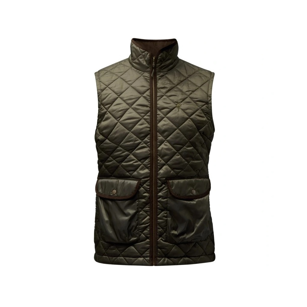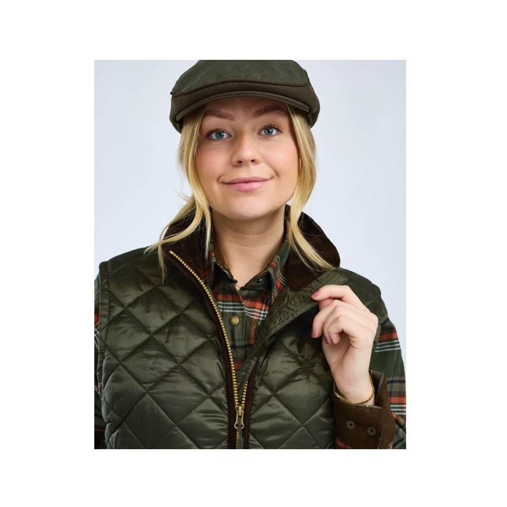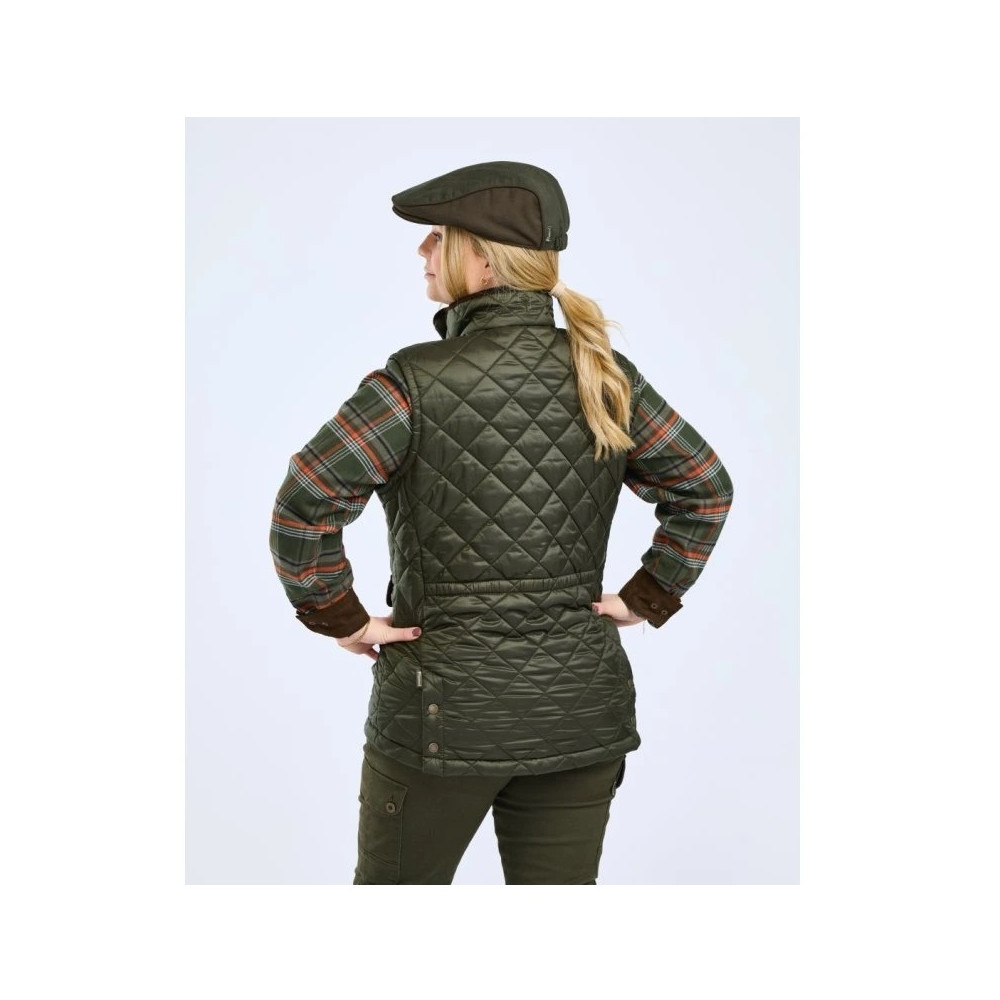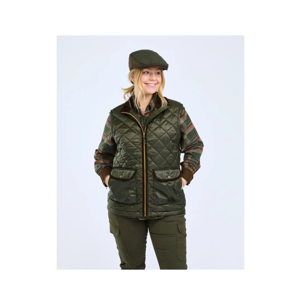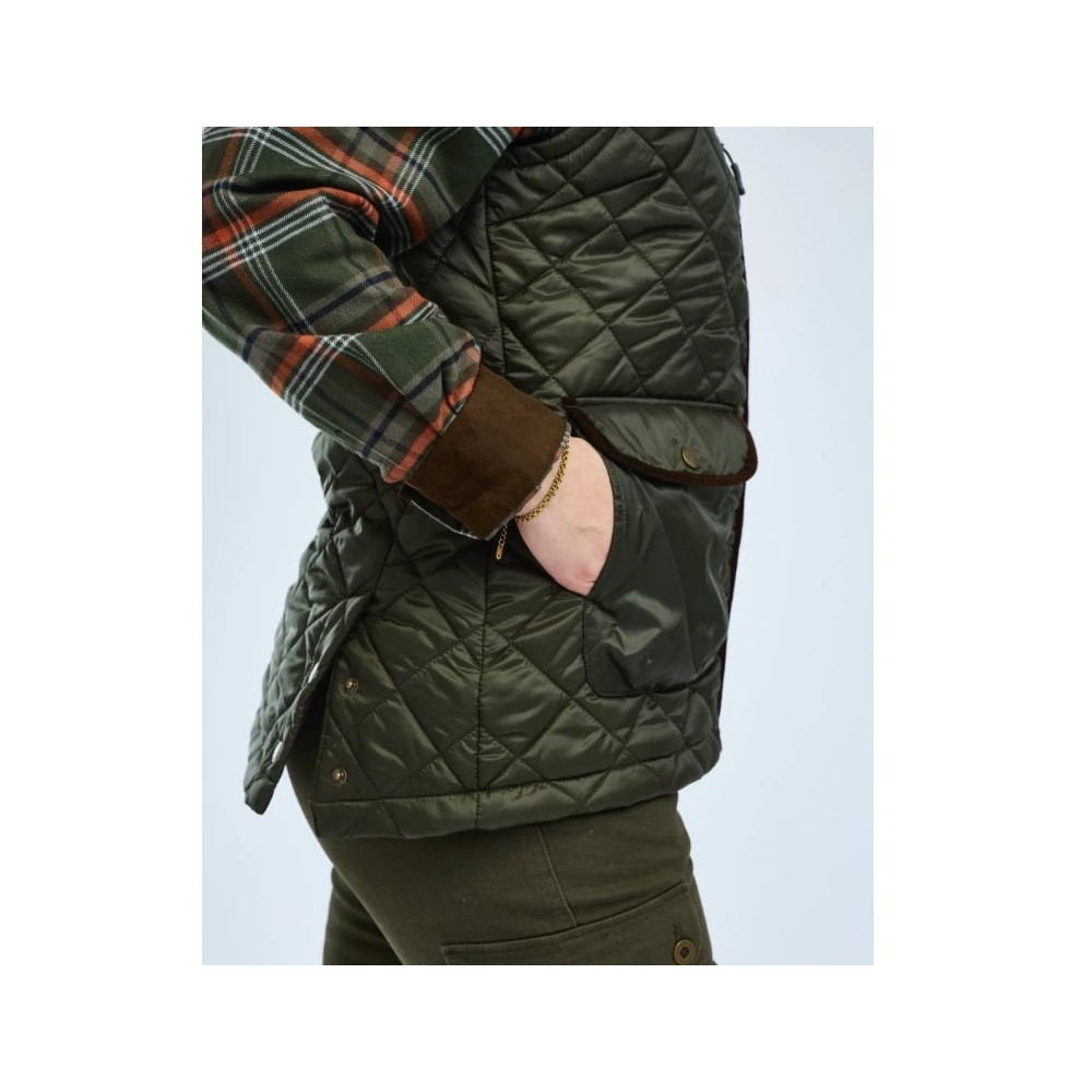 Zateplená dámská vesta s prošívaným vzorem, ideální pro lovecké účely a procházky po lovu. Má přední kapsy s knoflíkovými klopami na uložení munice a vnitřní kapsu na zip pro cennosti. Vesta je větruodolná a ošetřena vodoodpudivou úpravou bez PFC. Má ženský střih a lze ji na zadní straně rozepnout pomocí knoflíků, což poskytuje více prostoru při sezení. Detaily v hnědém manšestru dodávají vestě stylový vzhled. Skvělá také jako elegantní vrstva přes košili – pro práci, lovecké zkoušky nebo procházky v lese.