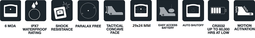 Baterie CR2032 se vkládá shora, což umožňuje její výměnu bez demontáže kolimátoru ze zbraně. Optika je bez paralaxy a poskytuje ostrý obraz v celém zorném poli.